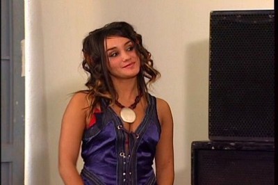 In Capitulos 73-75 Roberta is wearing light blue top in sport style, which she tied up on the side to show her belly, knee lenght combat pants, pastel pink high heel sandals (look like the same as in capitulo and matching belt. She is wearing it at the rehearsal of Facundo band, later when visiting Lupita in her house and spending the night there, and at school the next day.