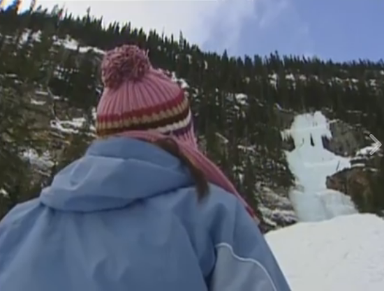 Last day in Canada, Capitulo 164 Roberta is wearing beige sheepskin coat, brown flared pants with some white print, and the same pink beanie/scarf. She has some cream sweater under the coat. Unfortunately I couldn't make the screen any better, sorry.