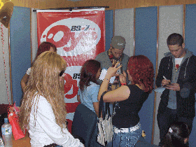 And a few days later we move to another event which is meeting in Radio Oye! and givin autographs. Here we have Dulce again wearing white tank top and camo pants. Anahi wore some white sweatshirt and blue pants while Maite was wearing burgundy top. The quality is horrible, I know.