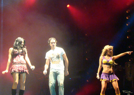 First outfit in Belo Horizonte, as we could see in the before the show post, was the purple and yellow set. This time Anahi wore it with yellow platform boots. Later she changed for all white, wore a black T-shirt over the white crop top which of course she later took of. And at the end she was wearing her black mini skirt with white ruffles.